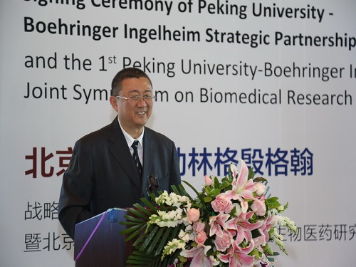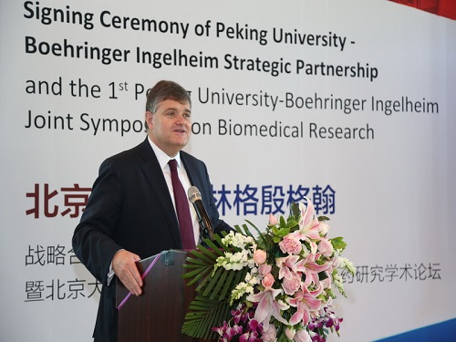 2017年5月16日,北京大学-勃林格殷格翰战略合作伙伴协议签署仪式暨北京大学-勃林格殷格翰第一届转化研究论坛在北京大学博雅国际会议中心举行。北京大学副校长王杰和勃林格殷格翰公司早期研究高级副总裁Clive R. Wood博士出席签约仪式。北京大学-勃林格殷格翰战略伙伴关系旨在共同推动早期科学创新,填补肿瘤、肿瘤免疫和免疫调节、呼吸系统、心血管代谢及中枢神经系统疾病等领域内的医疗需求。该战略伙伴合作关系包含多种合作形式,包括以具体科研项目为基础的共同研究、博士后奖学金及BI讲席研究员。北京大学研究团队将与勃林格殷格翰内部研究人员紧密合作,利用各自在制药研发领域的专长,通过创新研究方法及洞见,在公司核心治疗领域以及其它治疗领域找到创新靶点和药物。勃林格殷格翰希望通过该项合作,带来更多具有突破性潜力、同类第一的新药,将勃林格殷格翰在亚洲的研发带入一个新的水平。