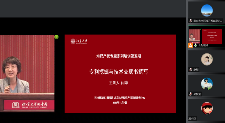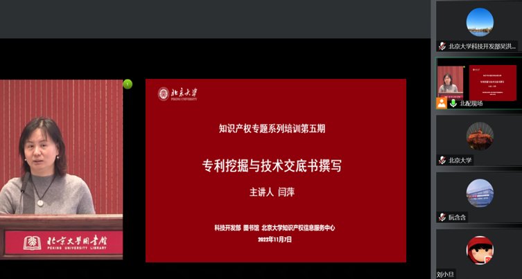11月7日下午,由科技开发部、图书馆、北京大学知识产权信息服务中心、北京大学科学技术协会共同举办的2022年知识产权专题培训第五期——“专利挖掘与技术交底书撰写”培训会成功举办,来自各个院系的线上线下师生共计142人参与培训。