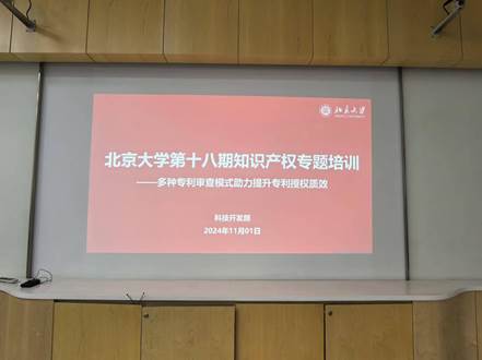 11月1日,科技开发部主办的北京大学知识产权专题培训第十八期——“多种专利审查模式助力提升专利授权质效”在王克桢楼107会议室成功举办。本次培训由国家知识产权局专利局审查业务管理部审查资源调配处副处长袁克卿主讲,来自材料科学与工程学院、物理学院等院系的近100名师生通过线上线下方式参加了培训。培训会由科技开发部副部长王阿乐主持,科技开发部知识产权办公室相关人员参加会议。