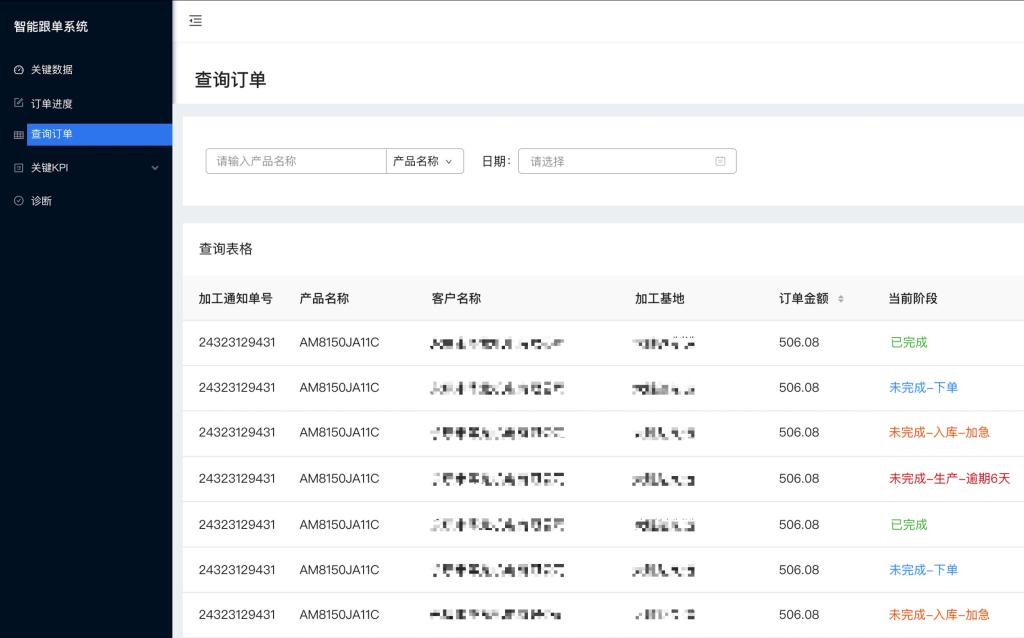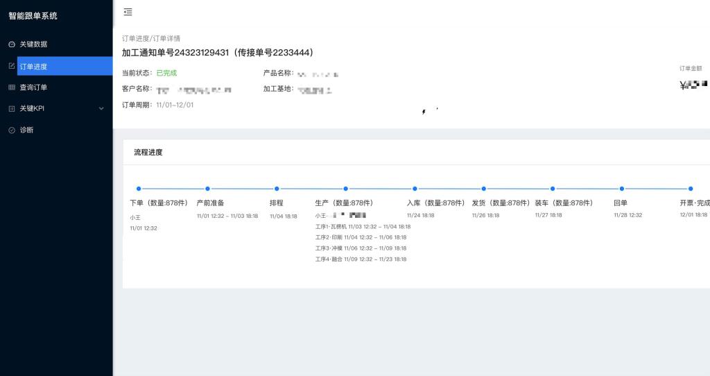 2、移动端跟单进度,多源异构数据融合,实现生产环节全流程线上实时可见;