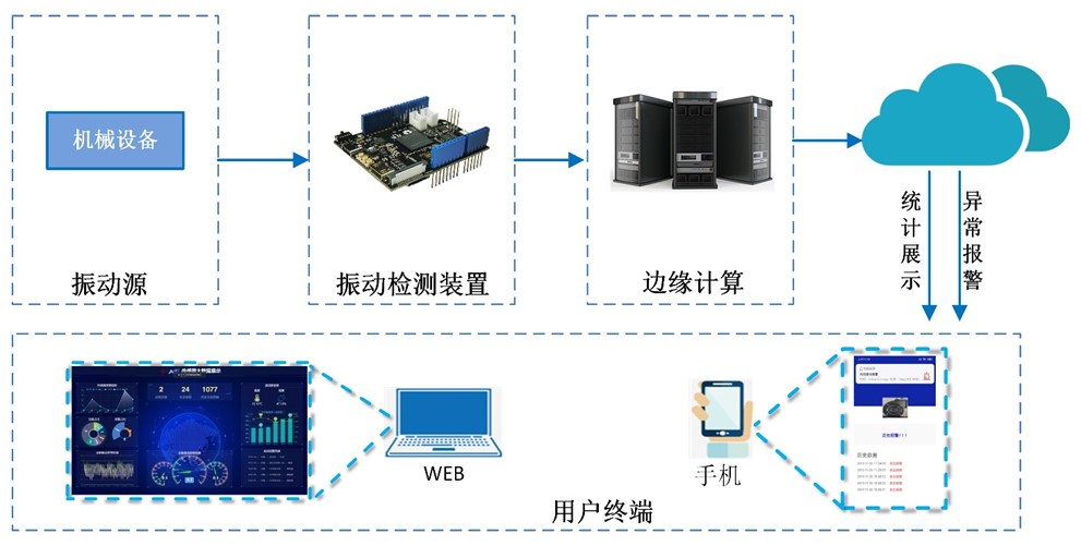 振动检测装置可实现多个应用场景,例:①工业设备异常检测及故障诊断:通过采集振动信息发现异常,在手机端及大数据平台可有效监测分析设备健康状态与故障原因。②工业设备预测性维护:通过在线训练得到设备的运行趋势,进而预测其运行情况。③工厂生产状况监测:通过训练设备生产不同类型产品的振动信息达到生产状况的监测。④设备状态检测:训练并得到设备各种状态下的运行规律,如空载、负载、运行、故障等。