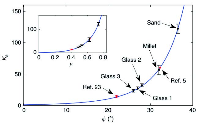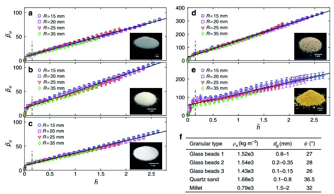 课题组发表在NatureCommunications上的研究工作证实了颗粒材料具有复杂流体的典型特征。通过准静态压入实验,定量表征了介入体在颗粒材料中的阻力-深度特征曲线。并从理论上了证实:通过引入一个与颗粒材料内摩擦角相关联的比例系数,流体力学中的经典阿基米德定律能够用来描述颗粒流的准静态阻力。即介入体准静态运动时所受阻力正比于颗粒密度和排开的材料体积。修正后的阿基米德定律中的比例系数是颗粒材料内摩擦角的强非线性函数。该理论结果不仅能够被课题组自身的实验所证实,而且能够被已有文献的实验结果所验证。