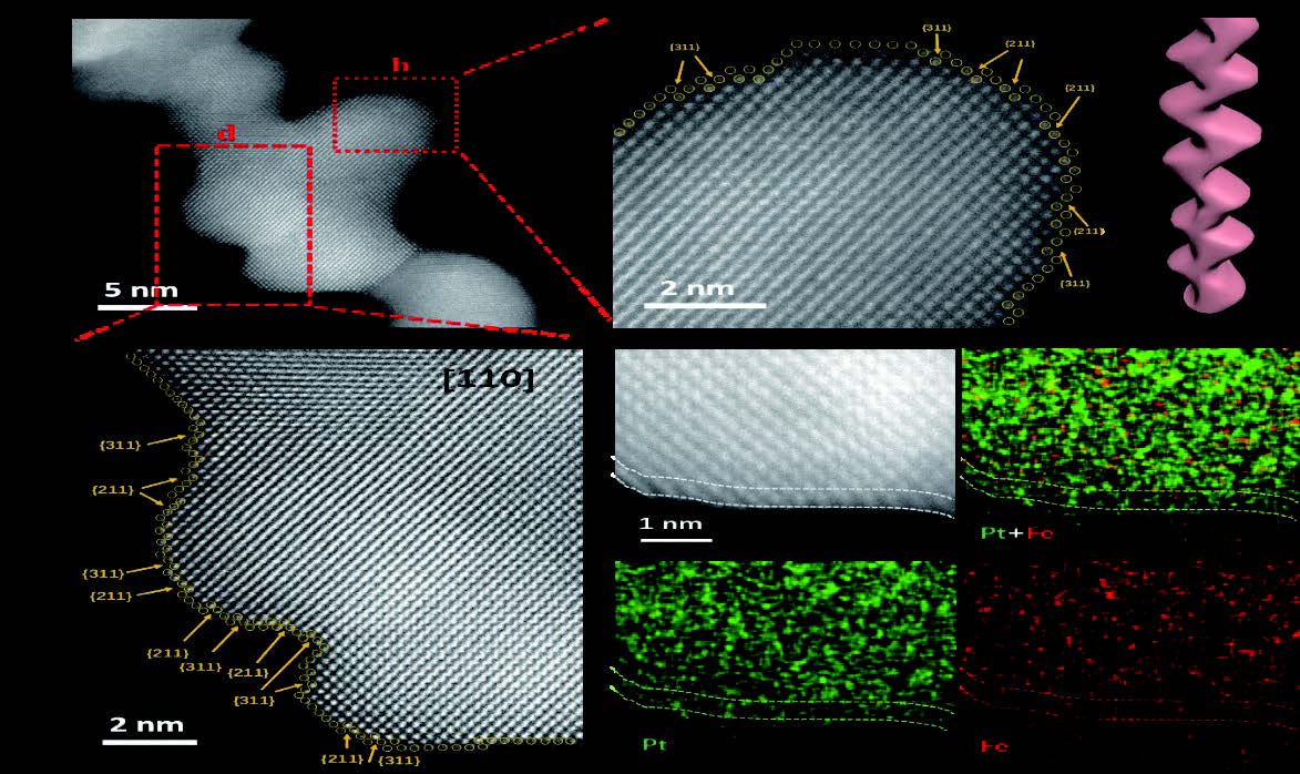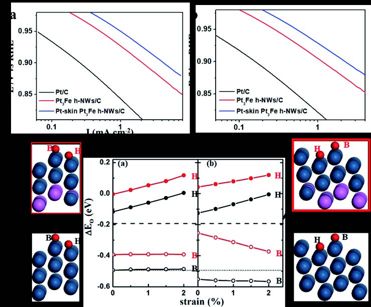 电池高性能低铂电催化剂研究首先合成含有高指数面的Pt3Fe 多级纳米线,再通过煅烧得到含有两个原子层厚的 Pt-skin结构,并评估了该材料在酸性介质中的氧还原和醇氧化催化性能,最后基于 DFT 理论计算结果证明含有高指数面的 Pt-skin表面对反应中间体的吸附能优化,有利于电催化反应的进行。该工作首次将 Pt-skin和高指数面结合,在催化剂活性和稳定性方面有了很大提升,为高性能电催化材料的设计和开发指出了新方向。