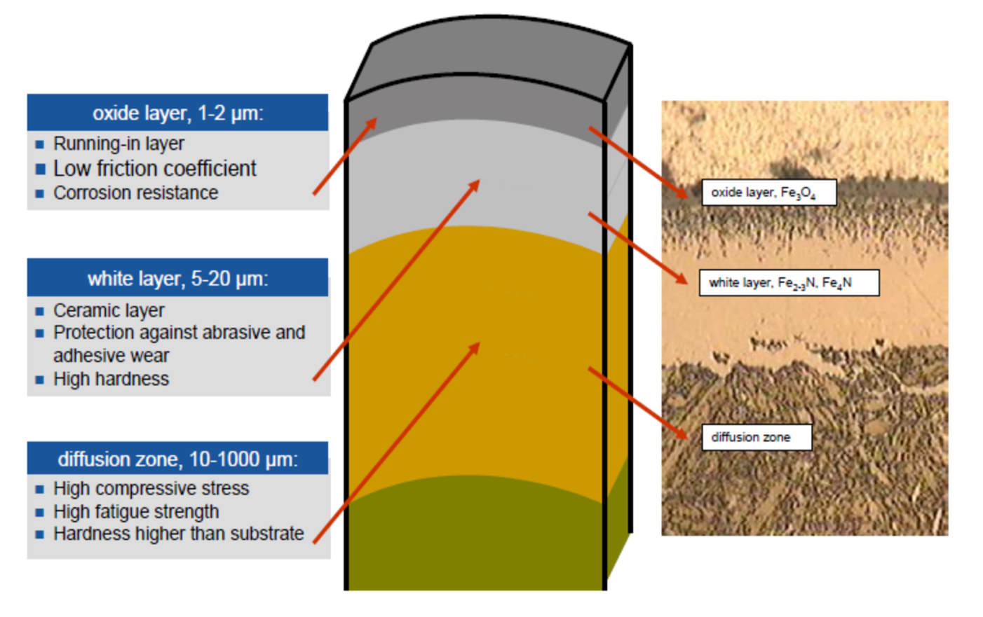 等离子体渗氮渗碳处理后形成的表层硬化层结构示意图