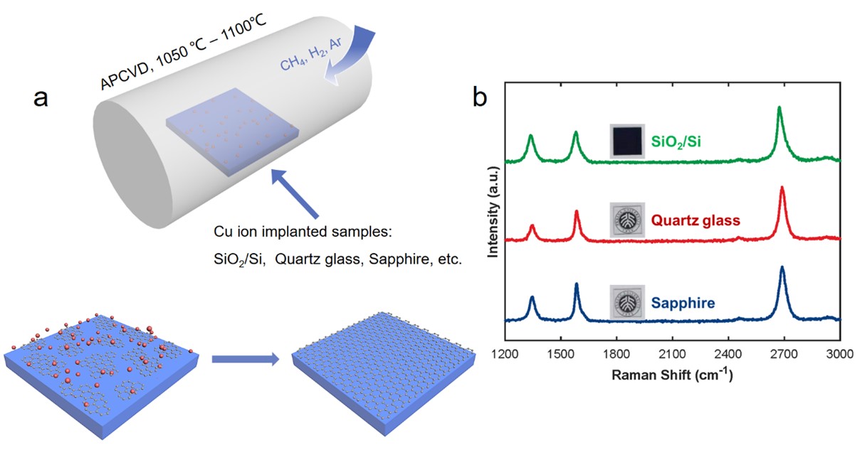 本项目设计开发了一种石墨烯玻璃制备方法,通过利用离子注入技术,将过渡金属粒子注入到玻璃表面,然后在石墨烯生长过程中注入的金属粒子有效提升玻璃表面对于碳源的裂解能力,并且促进石墨烯晶畴的成核和生长。这种方法成功在二氧化硅、蓝宝石、石英玻璃等绝缘衬底上制备出高质量单层石墨烯。