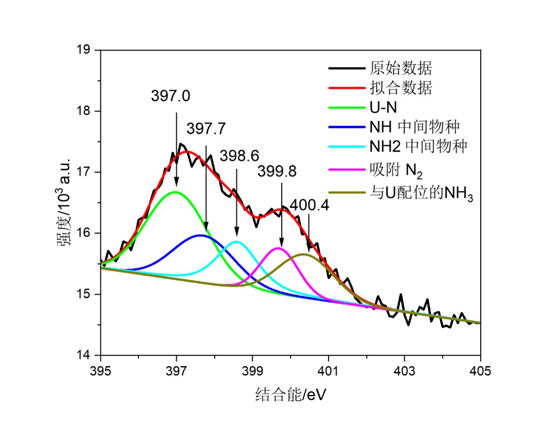 低价铀-少层石墨炔复合材料产氨后的氮元素XPS谱图。氮元素在397.0、397.7、398.6、399.8以及400.4 eV存在还原态氮原子,N-H物种,N-H2物种、吸附氮气分子以及与铀配位的氨的信号。