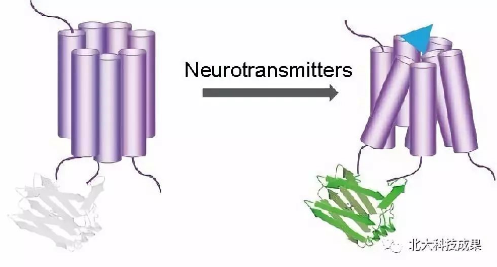 神经递质作为神经元与神经元及神经元与细胞之间沟通的媒介分子,介导了发育、信息感知,运动及大脑的高级认知功能。随着生化分离纯化技术的发展以及人们对大脑精细结构的进一步了解,现如今已发现有几十种重要的神经递质。而神经系统在时间和空间上的高度复杂性对研究特定神经递质的动态变化及其功能提出了极大的挑战。本项目成功构建了一系列新型的基因编码的神经递质荧光探针,可实现对特定神经递质动态变化的灵敏检测。该类荧光探针利用大多数已知的神经递质所对应的特异性G蛋白偶联受体(GPCR)与循环重排的荧光蛋白(cpGFP)融合,利用循环重排荧光蛋白的荧光强度变化来指示GPCR的激活,进而反应外源神经递质的浓度变化(图一)。我们命名该类荧光探针为GRAB探针,即为GPCR Activation Based Sensor的缩写。