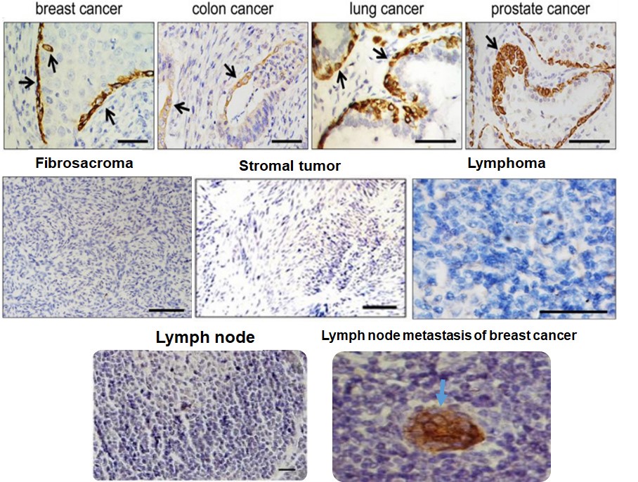 图2. 唾液酸化IgG主要表达在多种上皮来源的肿瘤干/祖样细胞(上图),而不表达在软组织肿瘤、B细胞淋巴瘤(中图)及正常淋巴结中浆细胞或B细胞(下左)。但可见于转移到淋巴结中的乳腺癌细胞(下右)。