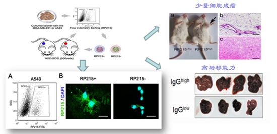 图3 唾液酸化IgG高表达的细胞,用特异性抗体(RP215)标记并流式分选发现,RP215阳性肿瘤细胞大量产生唾液酸化IgG(左下);被注射在SCID小鼠皮下后呈现少量细胞(500个)成瘤及高转移的特性。