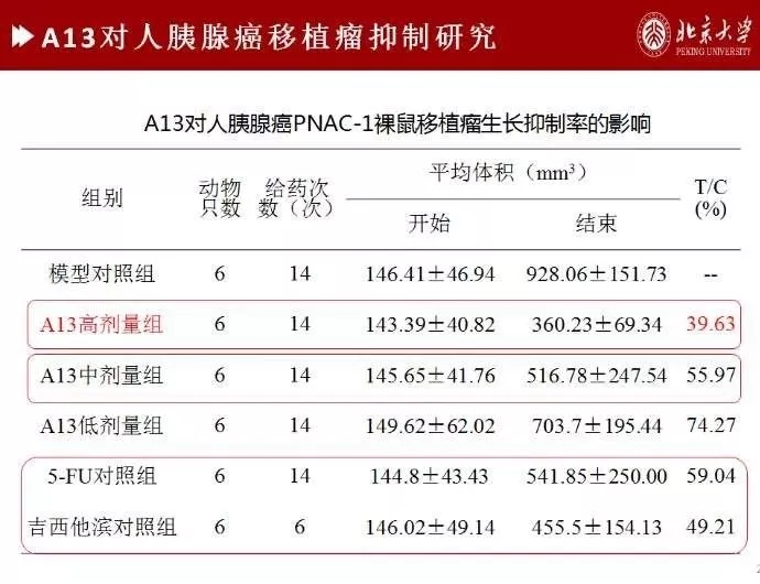 A13化合物经过两次不同机构肿瘤细胞测定,确定其抗胰腺癌和肺癌活性。与山东省药学科学院合作,测定人胰腺癌PNCA-1裸鼠移植瘤模型抗肿瘤作用。设置5-FU对照组,吉西他滨对照组和模型对照组,A13尾静脉注射给药,隔天给药时间为21天。实验结果是A13在60 mg/kg和120 mg/kg剂量条件下对人胰腺癌裸鼠移植瘤的生长的抑 制作用,相对肿瘤增值率分别为55.97%和39.63%,结果优于5FU(59.04%)和吉西他滨 (49.21%),对体重和饮食没有影响,各脏器解剖观察未见毒性病理变化。对照吉西他滨 组裸鼠表现出明显体重下降和饮食受阻。A13化合物在模拟大肠液16 h能保持稳定,在 血浆中96 h能保持稳定,为后续动物实验确定给药方式和给药时间。对肺癌SPC-A-1裸 鼠移植瘤小鼠也有治疗作用,A13的肿瘤相对增值率与培美曲塞对照组相当。