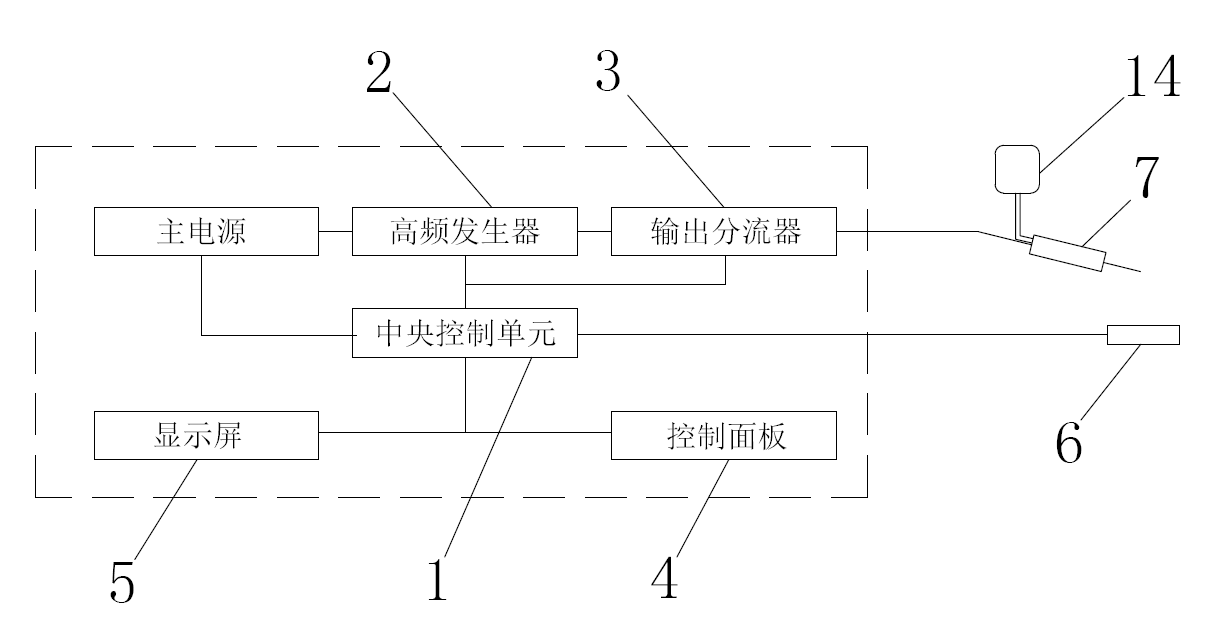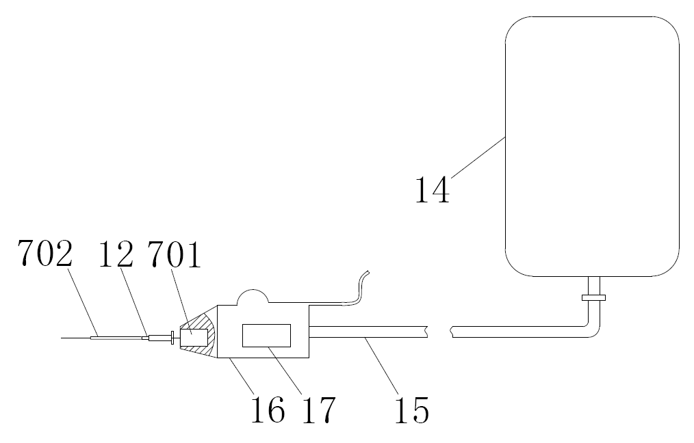 1-中央控制单元;2-高频发生器;3-输出分流器;4-控制面板;5-显示屏;6-病人电极;7-消融针;701-电极板;702-电凝针;8-电凝插孔;9-极板插孔;10-功率调节按钮;11-第一警报器;12-温度传感器;13-第二警报器;14-冲洗器;15-导管;16-观察仓;17-观察孔。