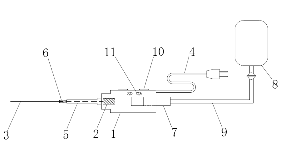 1-固定座;2-电极板;3-电凝针;4-连接线;5-保护鞘;6-温度探头;7-返血器;8-冲洗器;9-导管;10-开关;11-功率调节按钮。