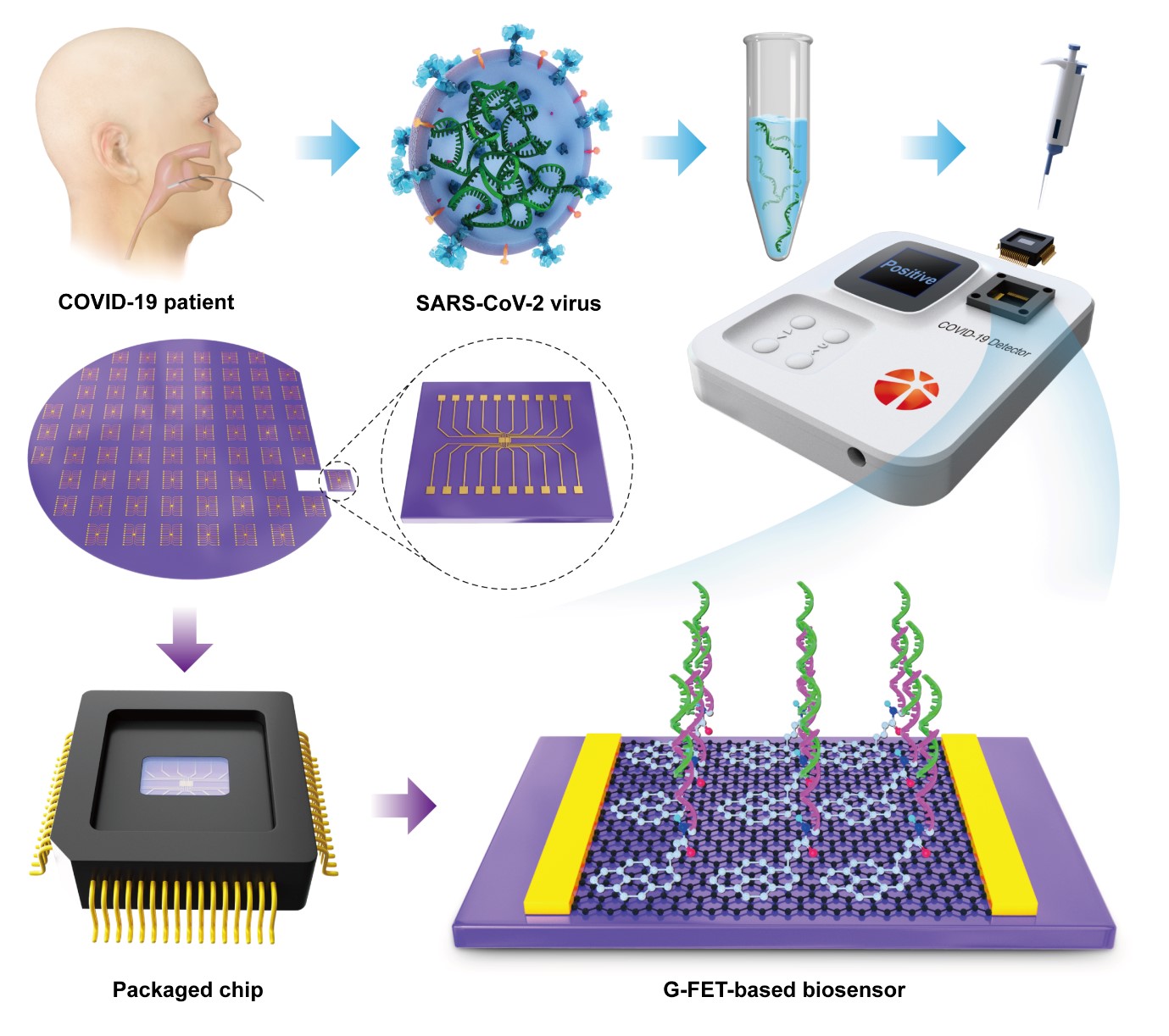 项目采用“自下而上”的器件制备工艺来构建石墨烯或硅纳米线场效应晶体管,突破性地把冠状病毒抗体与抗原互作和核酸杂交作用转化为可监测的电学信号。该检测系统主要由可插拔式封装生物芯片和便携式电检测仪组成(如图所示),提供了一种有效、准确、高通量的新冠现场即时检测工具。