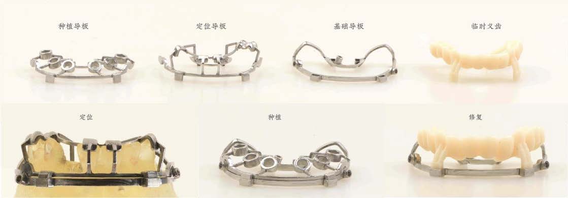 然而,常规手术导板无法全牙列即刻种植即刻修复治疗中进行使用。其应用受限的主要原因在于:1.余留牙影响导板戴入;2.粘膜支持降低导板的精准性;3.导板对牙弓和粘膜组织面的覆盖会影响手术中进行骨修整。在这一背景之下,项目组研究开发了利用患者口内余留牙作为定位、用牙槽骨骨钉进行固位支持的序列组合导板。并根据这一理念,研发设计了具有精密配件和关节结构的牙种植导向模板设计形式,将精准的牙支持定位导板、截骨导板和种植导板相结合,实现灵活简便的手术操作。