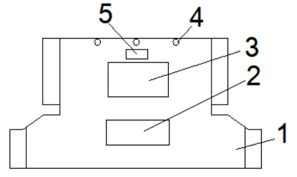 图为模块化摆位固定系统示意图,其中:1、用于头颈部肿瘤患者放射治疗摆位固定的头颈部热塑膜;2、设置在热塑膜上且与颈部气管插管位置对应的用于在放射治疗时保证患者气管插管不受触碰的气管插管保护装置;3、设置在热塑膜上且至少与口部位置对应的口部固定装置;4、设置在热塑膜上且与额部位置对应的用于在放射治疗时协助摆位对准的摆位指示结构;5、设置在热塑膜上且与两眼之间鼻梁部位对应的用于在放射治疗时干预患者眼球运动的眼部固定装置,包括:凝视杆安装座、可拆卸连接的凝视杆,后者上方设有用于指示患者凝视位置的凝视标识。