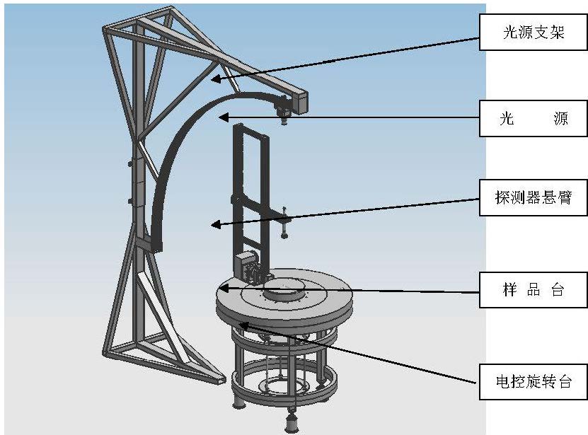 本发明涉及一种基于多角度偏振成像的地物密度和岩石检测装置,包括一辐射特性稳定光源、一多角度观测平台、一高光谱成像装置、一计算机和一供电电源所述高光谱成像装置包含一偏振组件、一光学镜头、一成像单元和一偏振组件调节装置,其中偏振组件、光学镜头和成像单元顺序同轴排列,光学镜头与成像单元固连且成像单元位于光学镜头的成像面上所述计算机连接所述多角度观测平台和高光谱成像装置。
